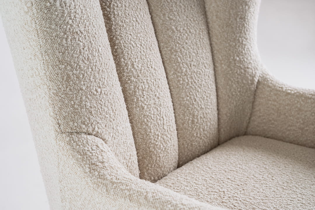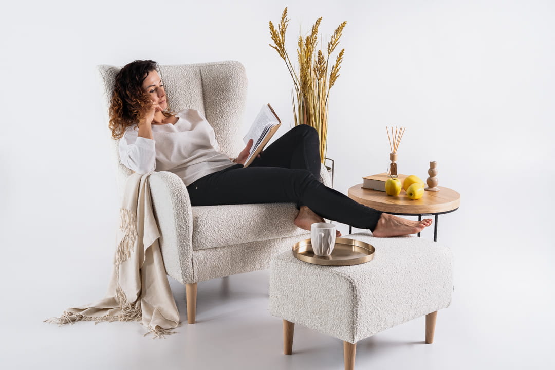 Przytulny fotel tapicerowany miękką tkaniną, z wysokim oparciem i drewnianymi toczonymi nóżkami, idealnie wpisuje się w styl Hygge. Jego miękkie, obłe kształty oraz wygodny podnóżek, sprawiają iż dzięki temu zestawowi możesz przenieść się na wyższy poziom relaksu.