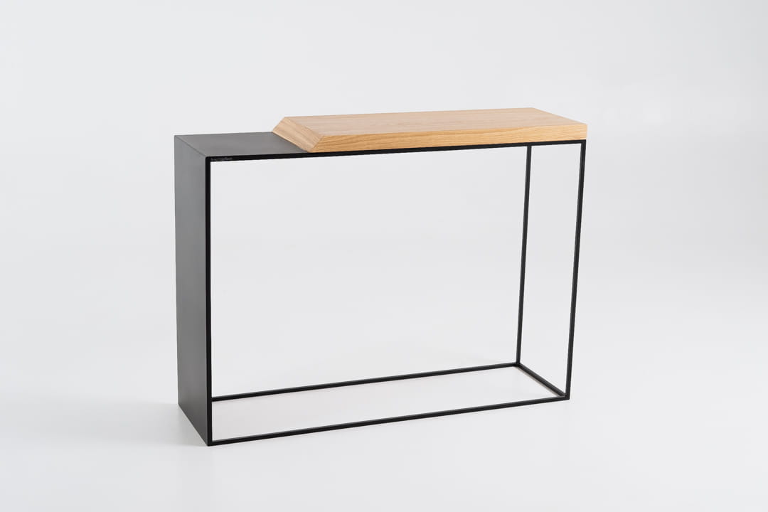 Ten wyjątkowy mebel wprowadza do wnętrza dynamiczną formę dzięki metalowej podstawie, która wywija się na górną krawędź blatu, gdzie w dynamiczny sposób łączy się z drewnianym elementem ściętym pod ostrym kątem. Wyprofilowanie krawędzi blatu dębowego przywodzi na myśl profil dłuta, podkreślając nowoczesny i oryginalny charakter konsoli.
