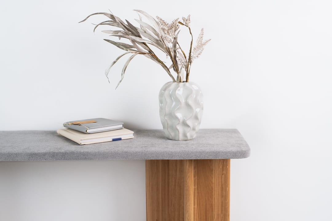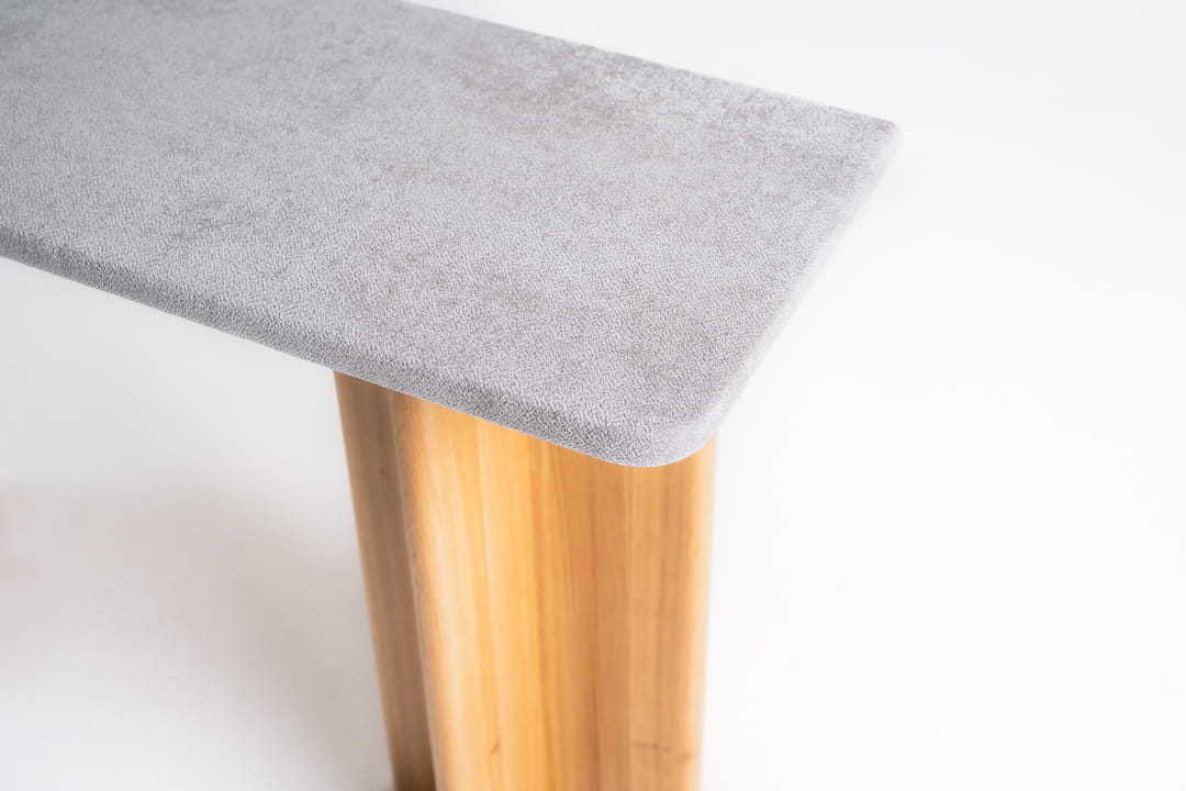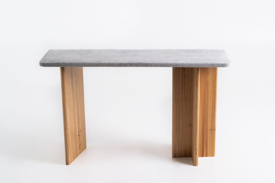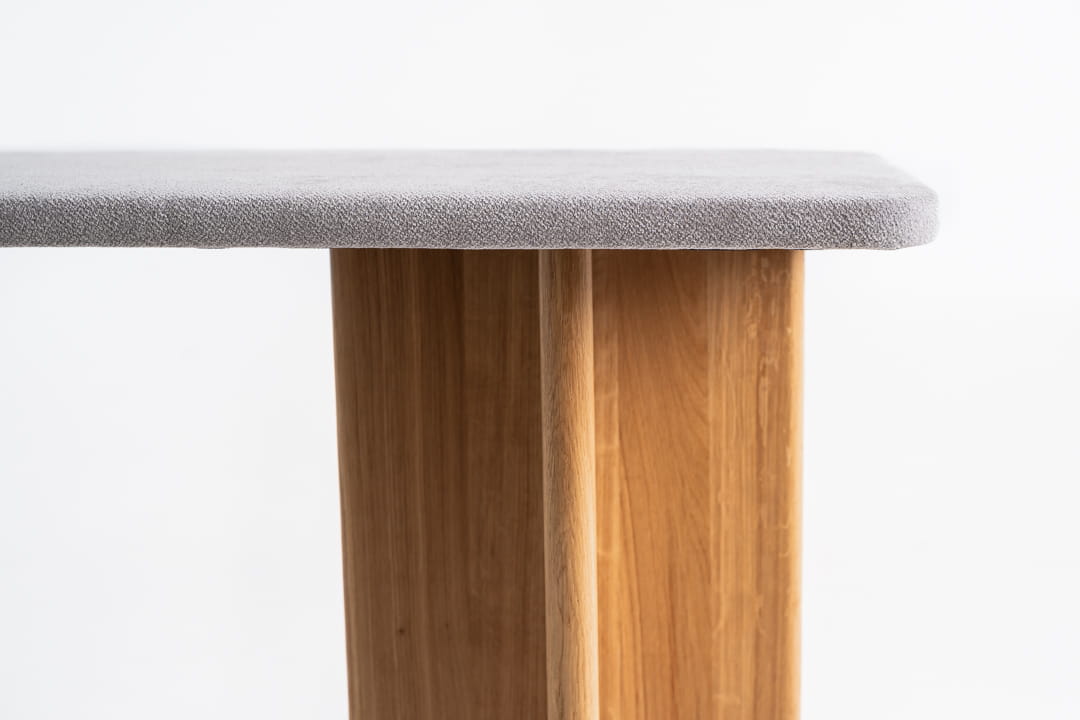 Konsola dostępna jest w trzech wariantach wykończenia blatu: z forniru dębowego, który wprowadza do wnętrza naturalne, ciepłe akcenty; w wersji tapicerowanej, z miękką i elegancką tkaniną; oraz z lakierowanego MDF-u – idealnego do nowoczesnych, minimalistycznych aranżacji.