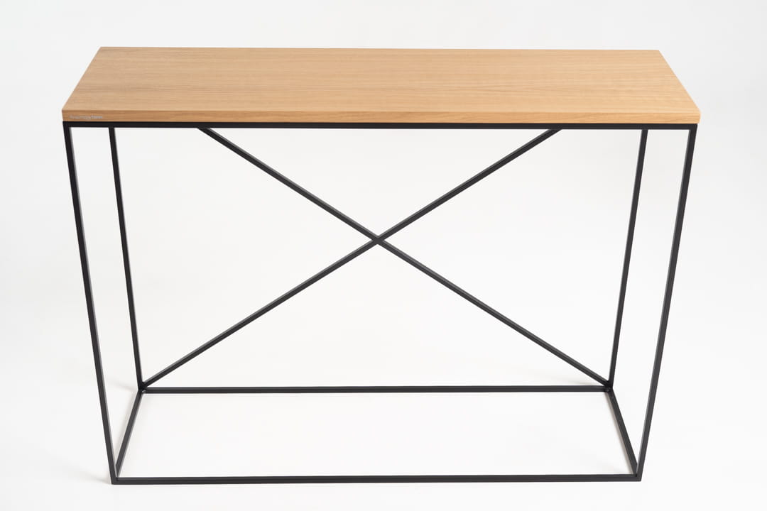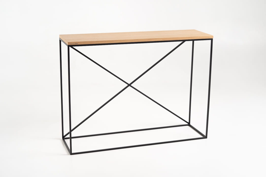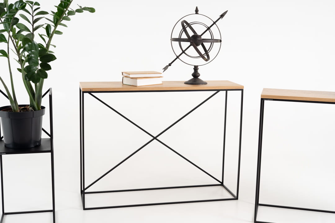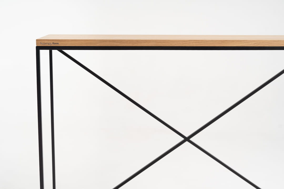 Konsola z kolekcji X marki SimplyForm, wykonana z trwałej stali lakierowanej proszkowo i ozdobiona blatem z forniru dębowego, to idealne połączenie elegancji i funkcjonalności. Jej loftowy styl doskonale wpisuje się w nowoczesne aranżacje przedpokoju i holu, przyciągając wzrok gości od pierwszego kroku.