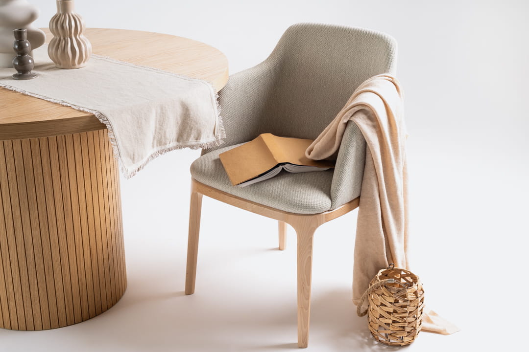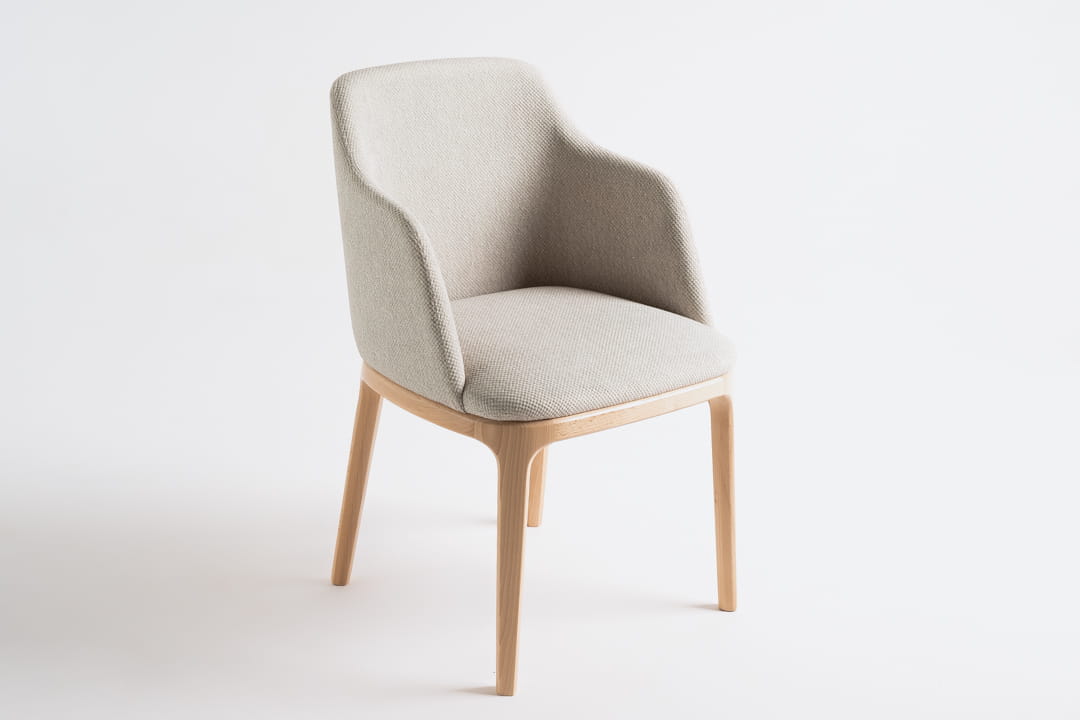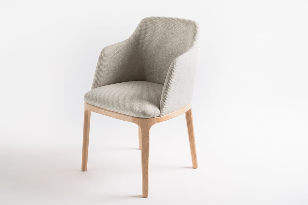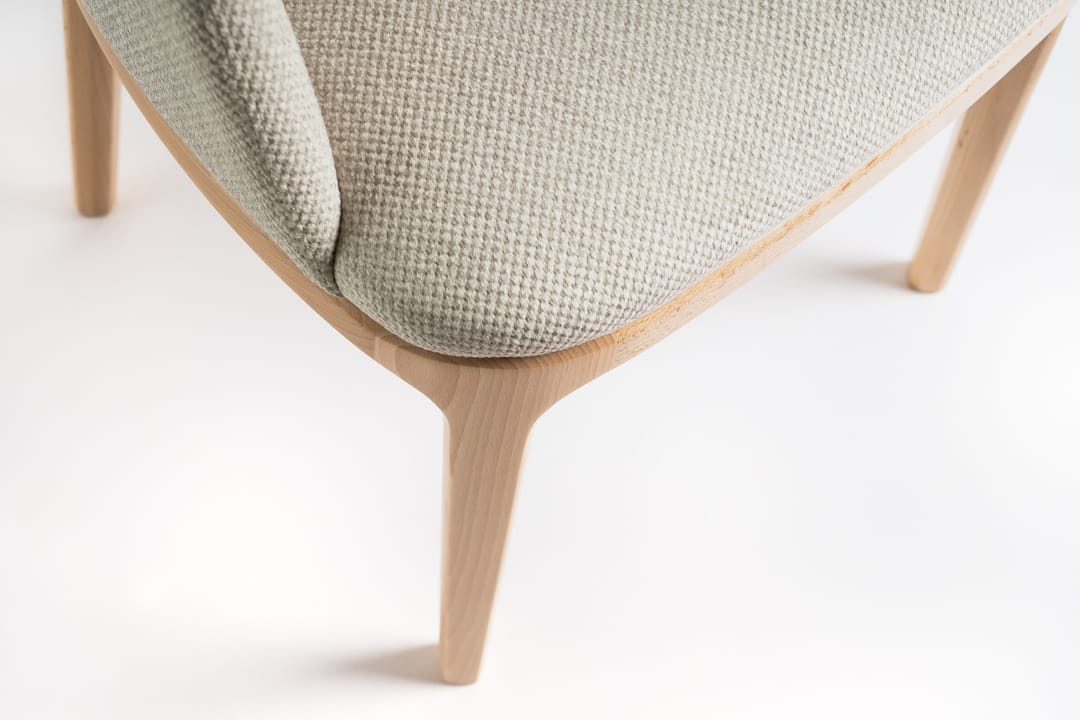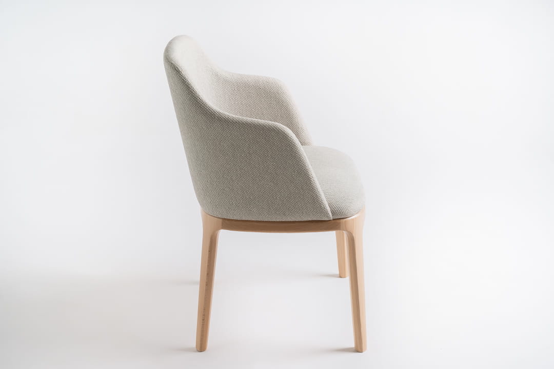 Solidna bukowa podstawa dostępna w wybarwieniach: buk naturalny, orzech oraz czarny, gwarantuje trwałość i stabilność. Krzesło występuje w dwóch wersjach – z podłokietnikami i bez, co pozwala na dopasowanie do indywidualnych potrzeb. Tapicerowane siedzisko zapewnia komfort, a możliwość personalizacji tkaniny umożliwia stworzenie unikalnego mebla.