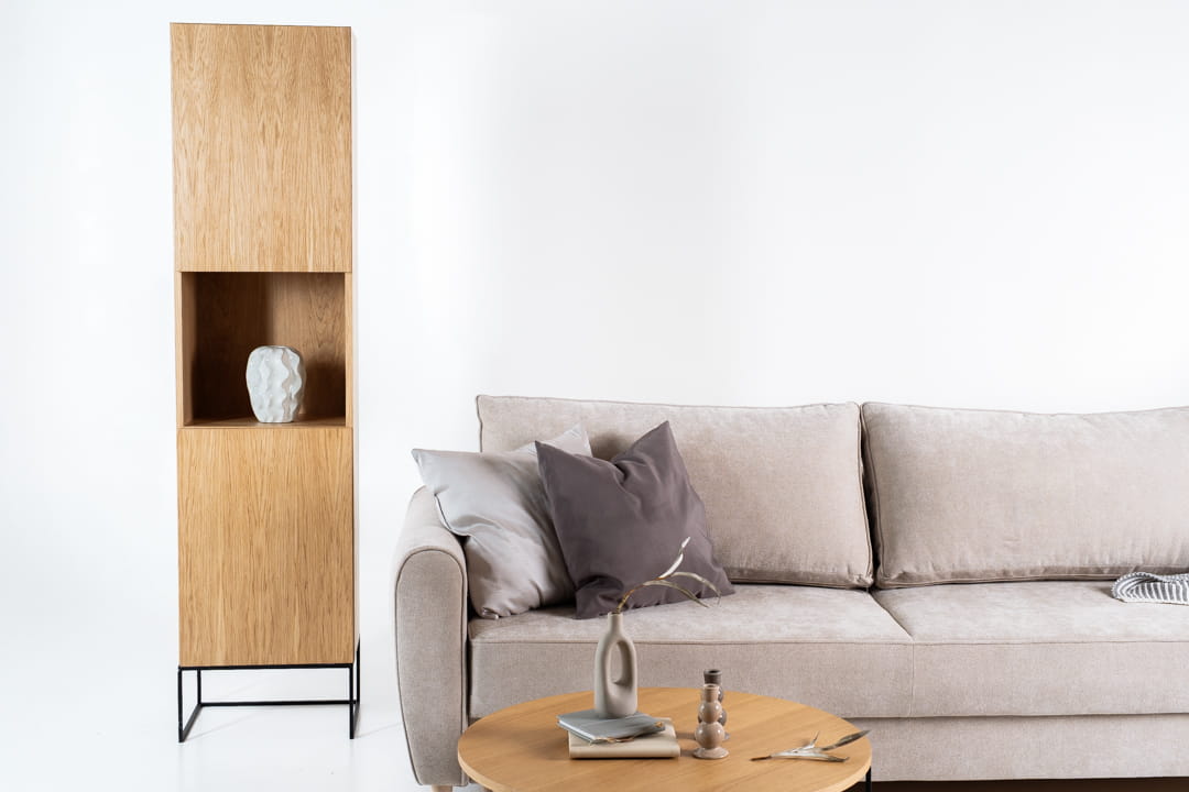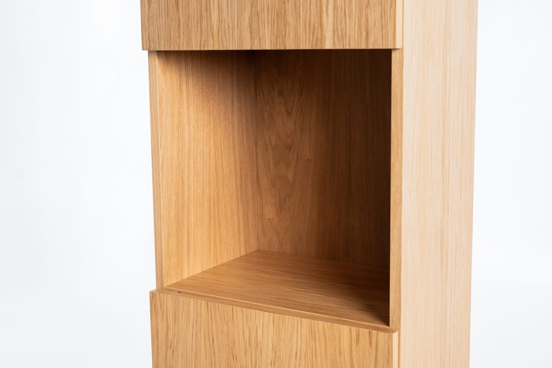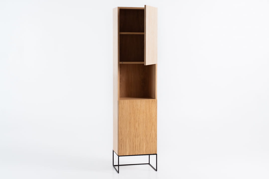 Mebel wyposażony jest w dwoje drzwiczek, pomiędzy którymi zaplanowano otwartą przestrzeń — idealną na dekoracje, książki lub pamiątki, które nadają wnętrzu indywidualnego charakteru. Takie rozwiązanie łączy funkcjonalność zamkniętego przechowywania z lekkością otwartej formy.