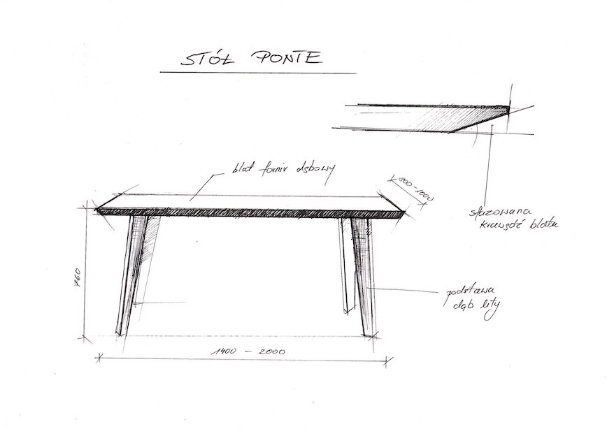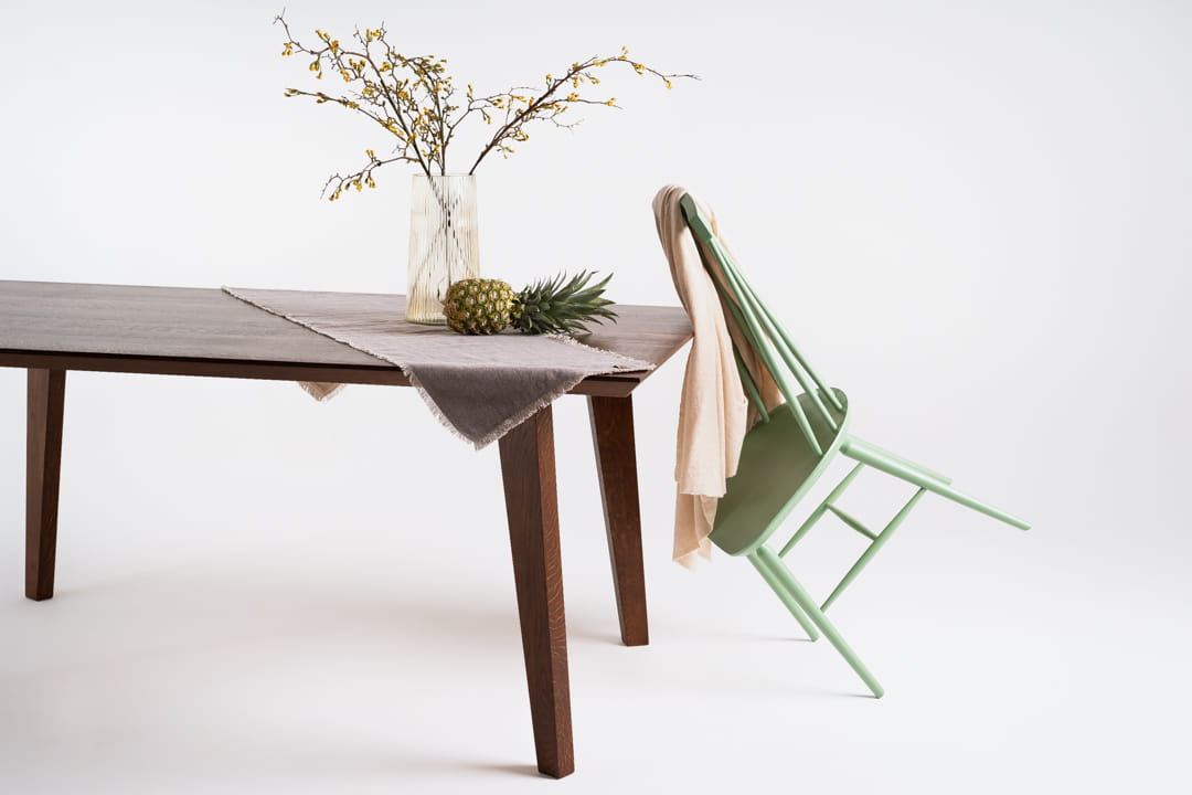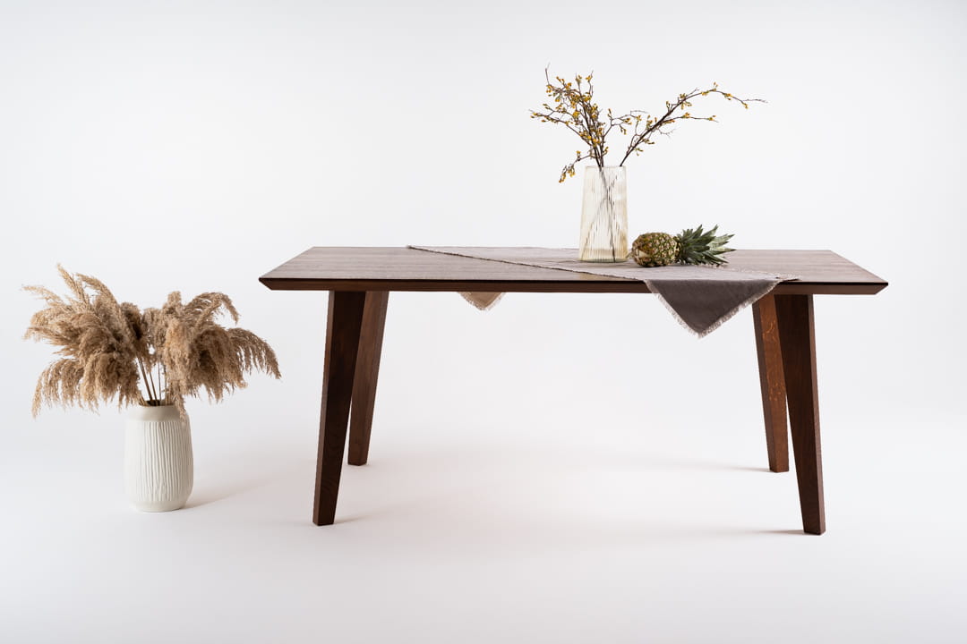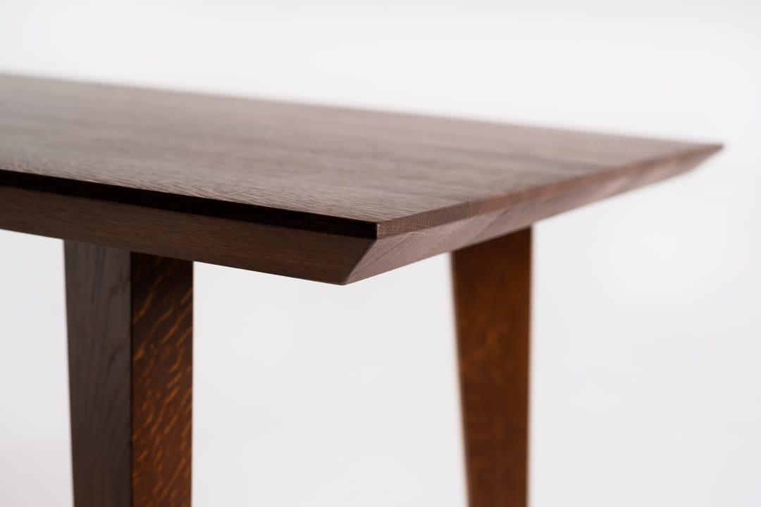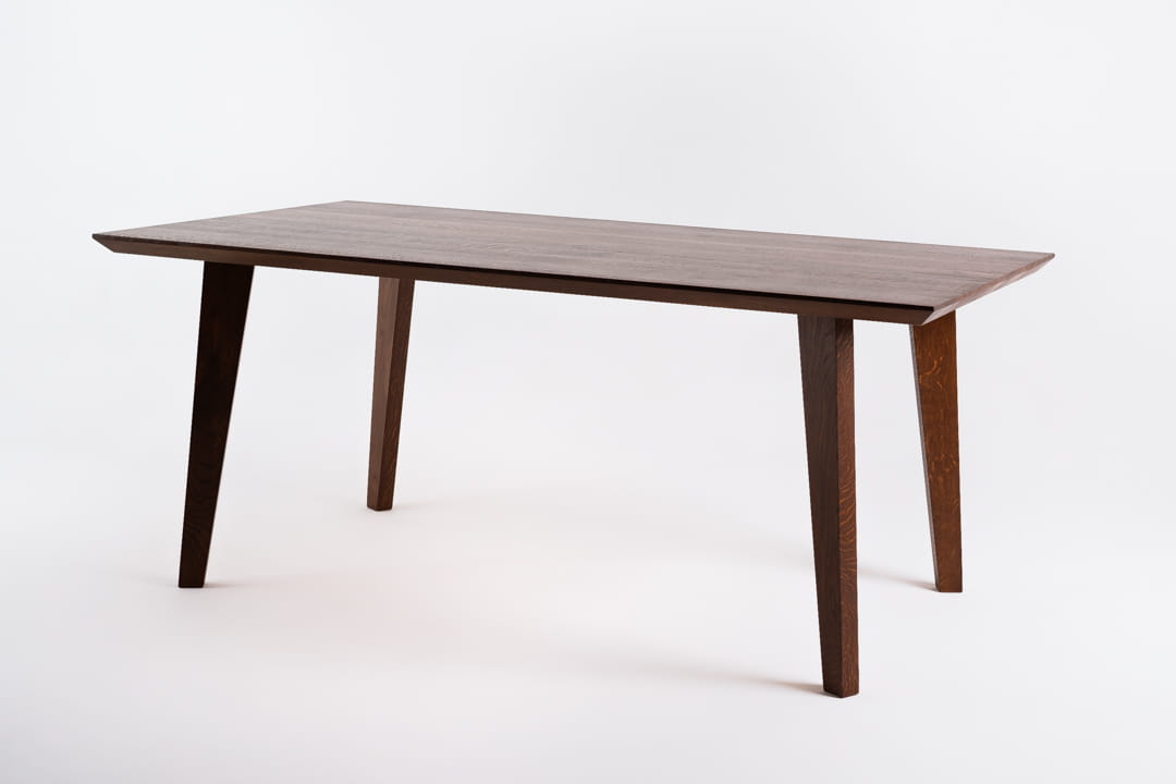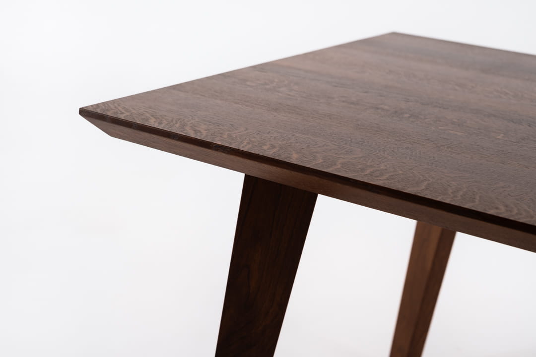 Stół PONTE posiada lite dębowe nogi ustawione pod kątem, co nadaje jego bryle dynamicznej i lekkiej formy. To wrażenie lekkości dodatkowo podkreśla mocno sfazowana krawędź blatu, który został wykończony dębowym fornirem barwionym na orzech.