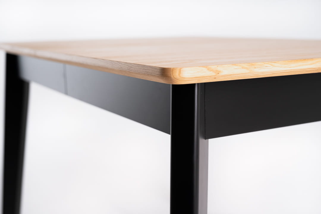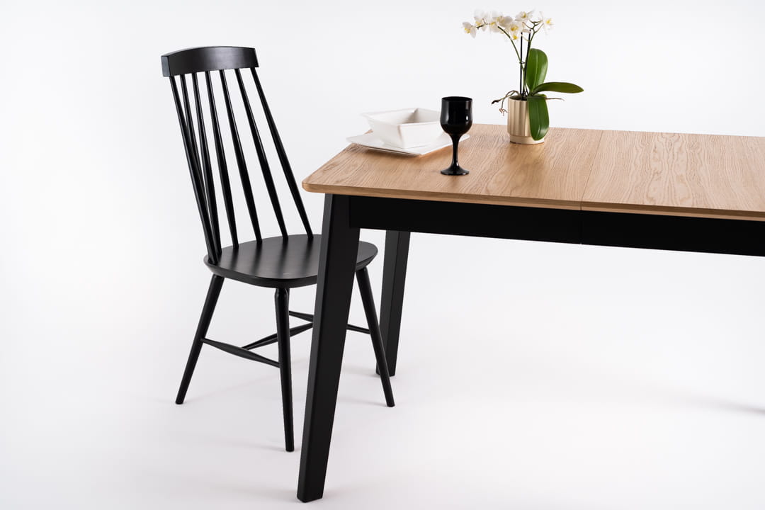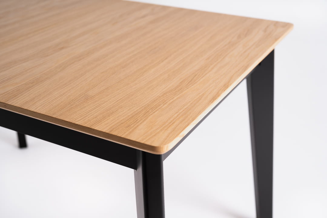 Zaokrąglone krawędzie blatu i nóg to ukłon w stronę klasycznego stylu, dzięki czemu stół SOPRO doskonale odnajdzie się zarówno w nowoczesnych, jak i klasycznych jadalniach. Blat fornirowany dębowy nadaje mu naturalnego uroku, podczas gdy nogi z litego dębu, ustawione pod lekkim kątem malowane na czarno, dodają całości wyrafinowanej elegancji.