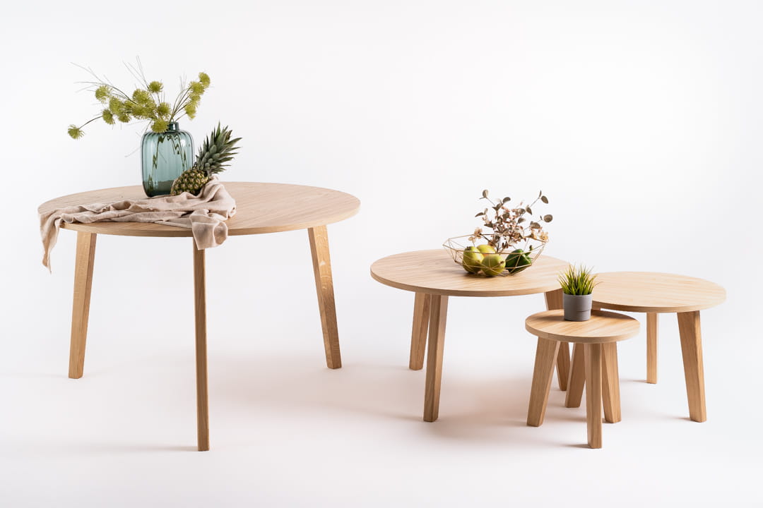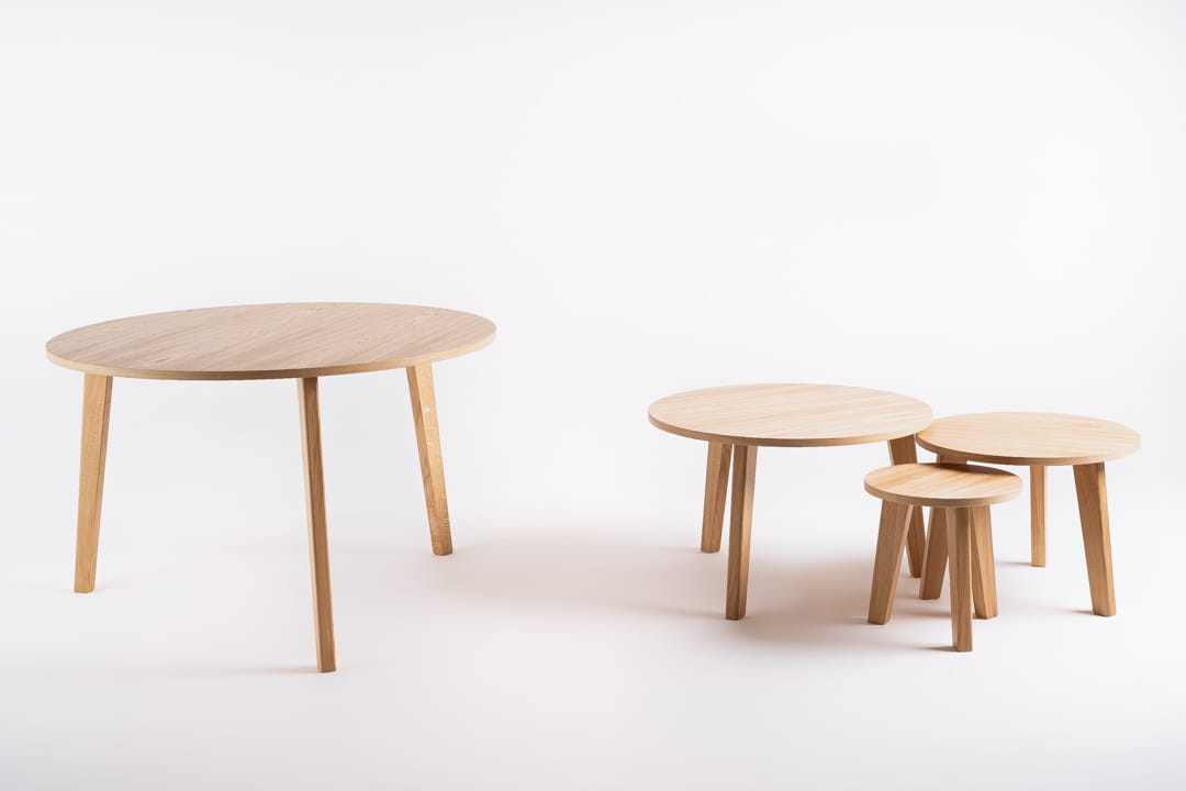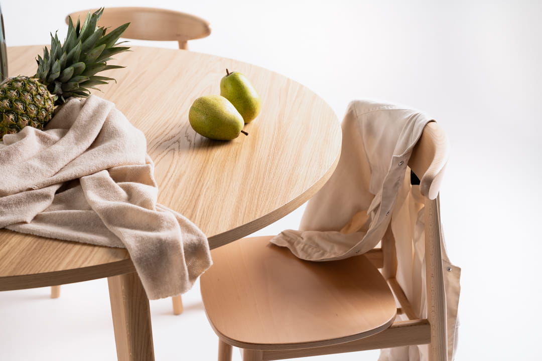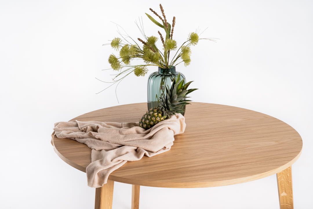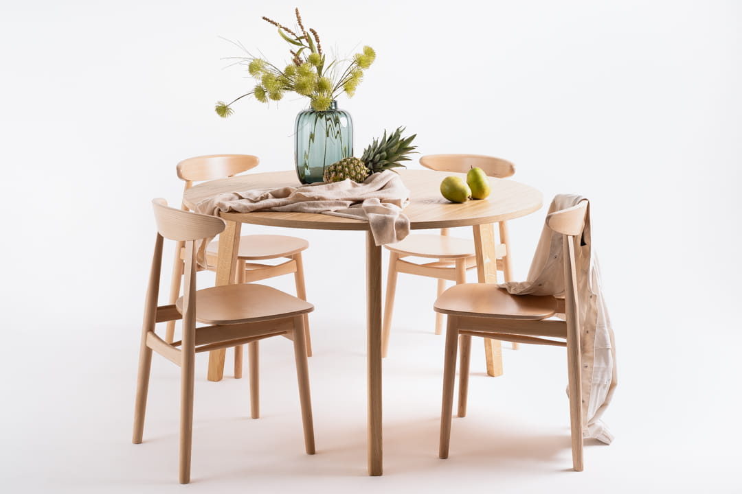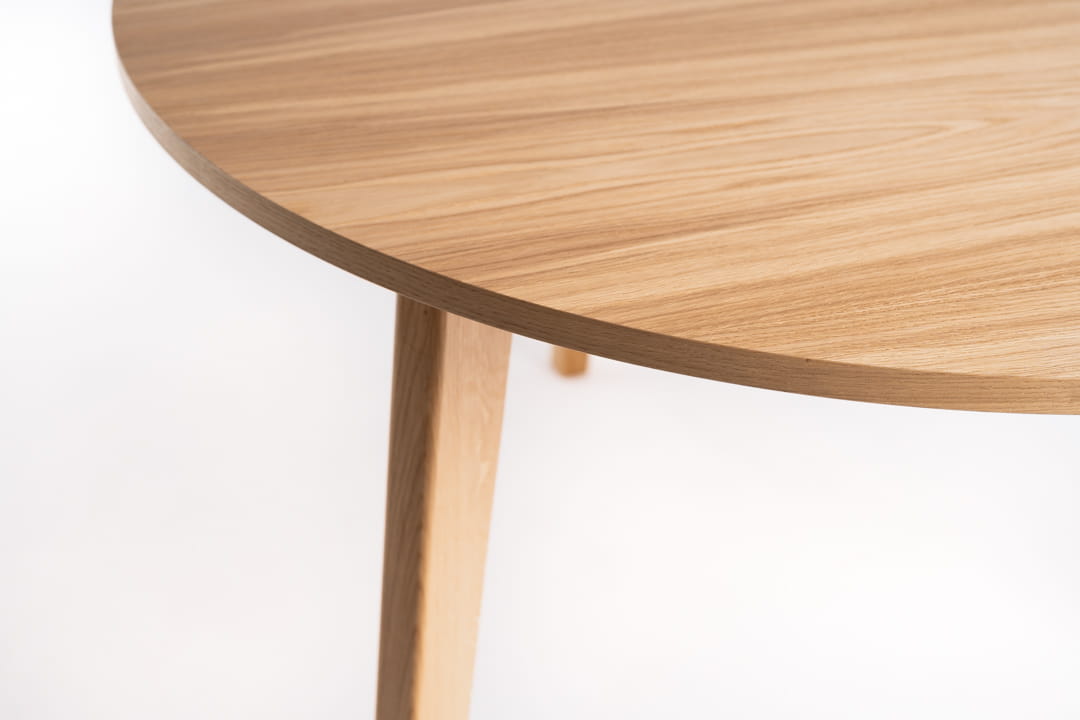 Okrągły blat stołu fornirowany jest dębem, co nadaje mu naturalny, ciepły wygląd, doskonale komponujący się zarówno z nowoczesnymi, jak i bardziej klasycznymi aranżacjami. Podstawa stołu wykonana jest z litego dębu, a nogi o geometrycznym kształcie dodają całości nowoczesnego charakteru.