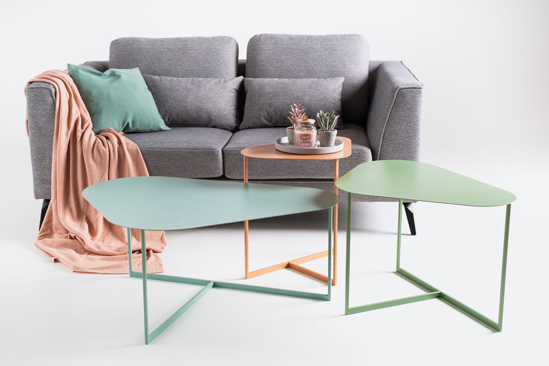 Ten zestaw stolików kawowych możesz ustawić osobno jako stoliki pomocnicze lub połączyć, tworząc funkcjonalną kompozycję do salonu. Dzięki różnym wysokościom stoliki można wsunąć jeden pod drugi, zwiększając powierzchnię użytkową bez zajmowania dodatkowego miejsca.