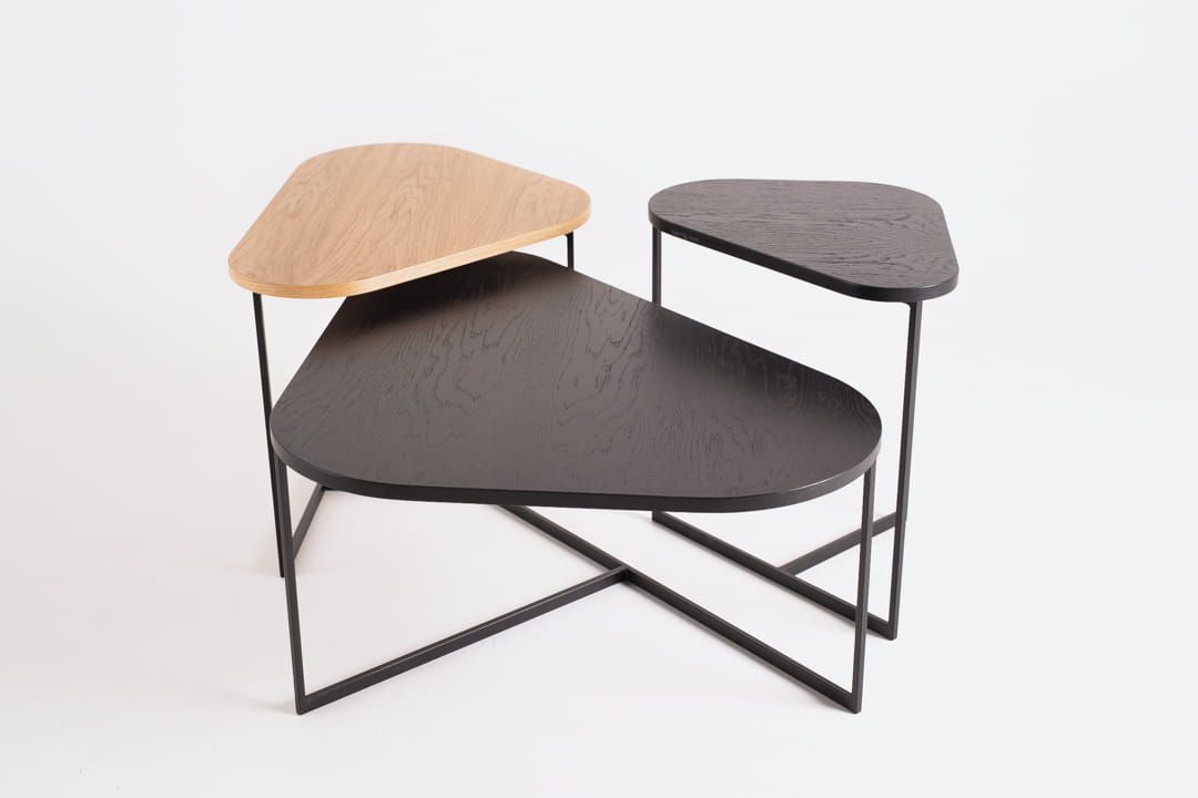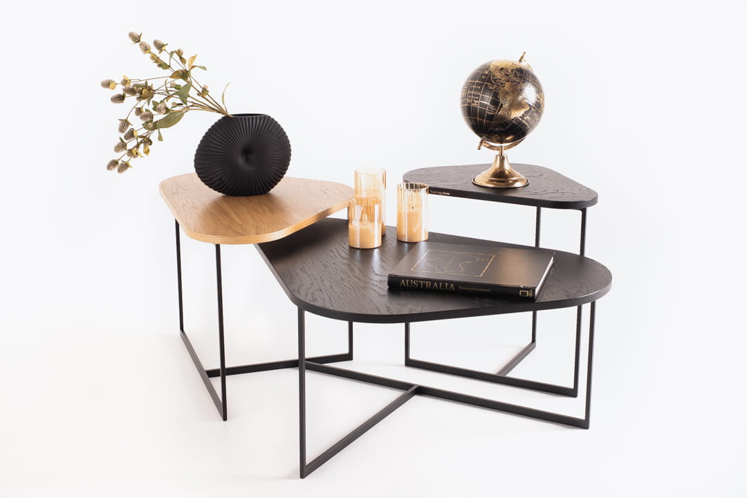 Ten zestaw stolików kawowych możesz ustawić osobno jako stoliki pomocnicze lub połączyć, tworząc funkcjonalną kompozycję do salonu. Dzięki różnym wysokościom stoliki można wsunąć jeden pod drugi, zwiększając powierzchnię użytkową bez zajmowania dodatkowego miejsca.