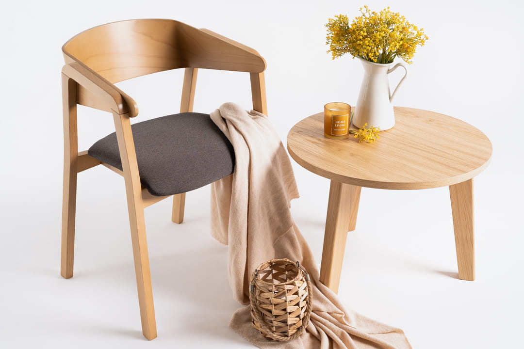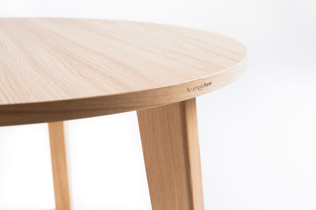 Okrągły blat stolika kawowego fornirowany jest dębem, co nadaje mu naturalny, ciepły wygląd, doskonale komponujący się zarówno z nowoczesnymi, jak i bardziej klasycznymi aranżacjami. Podstawa stołu wykonana jest z litego dębu, a nogi o geometrycznym kształcie dodają całości nowoczesnego charakteru. Występuje w trzech rozmiarach.