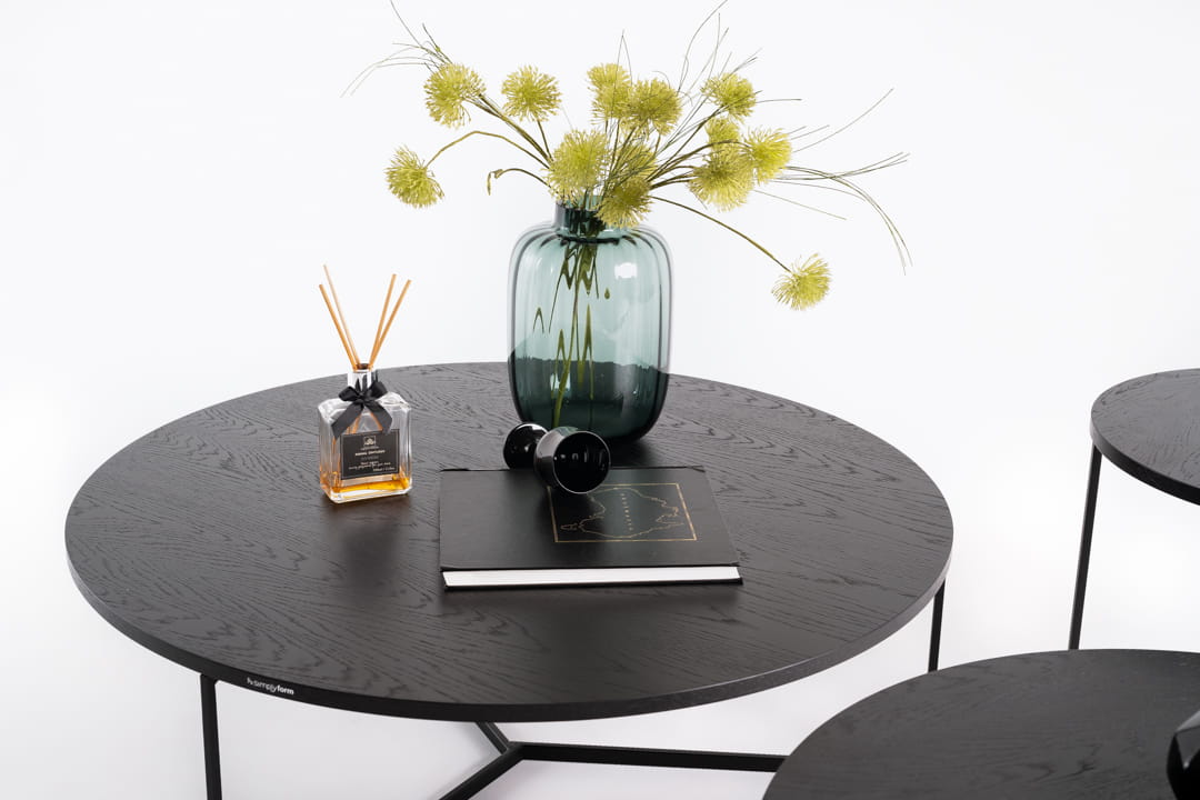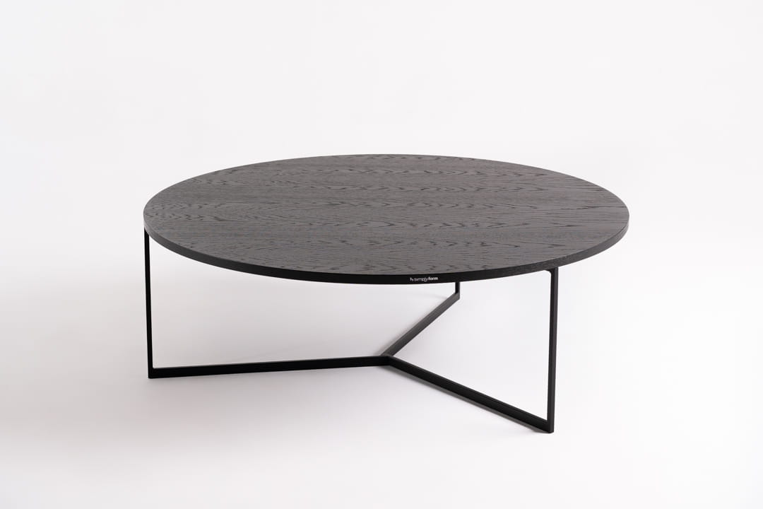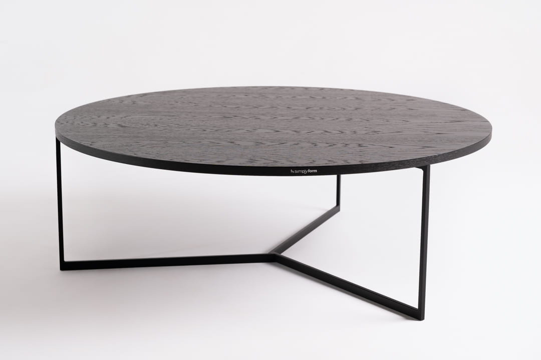 Stolik kawowy VEGA wood marki Simplyform - dynamiczna i minimalistyczna forma podstawy w połączeniu z czarnym okrągłym blatem fornirowanym to esencja stylu.