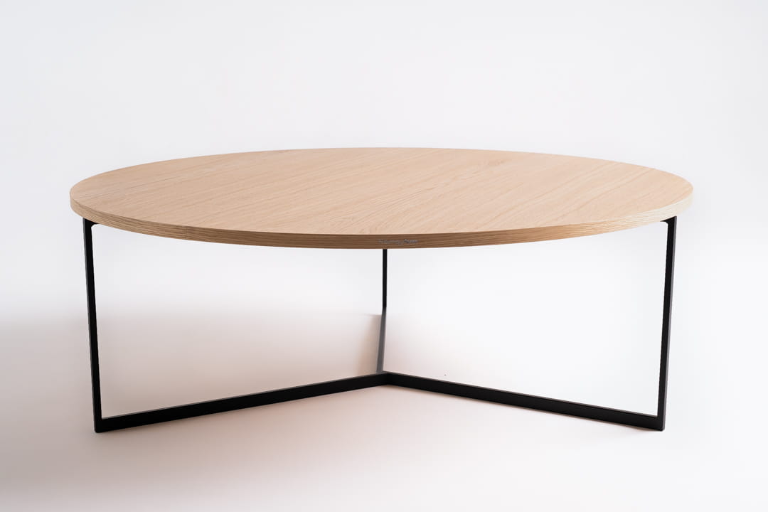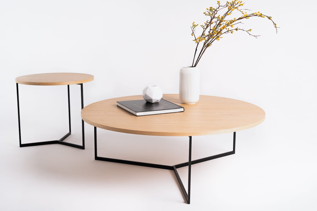 Stolik kawowy VEGA wood marki Simplyform - dynamiczna i minimalistyczna forma podstawy w połączeniu z naturalnym okrągłym blatem fornirowanym to esencja stylu.